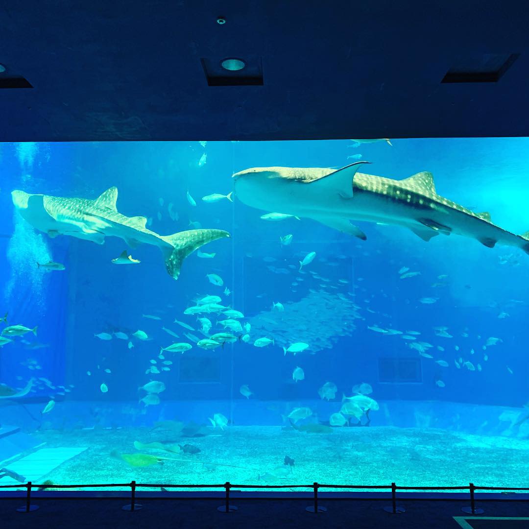 美ら海水族館は朝8:30開館とかなり早かったので、開館と同時に入り、ジンベイ手前の小さい展示物は全てスルーし、ジンベイザメのいる巨大水槽へ直行。誰もいない静かな水槽の前で、ジンベイザメの雄大な泳ぎにしばらく見とれていました。やっぱり美術館で絵を見るにしても、景色の良いところで風景を見るにしても、水族館で見るにしても、耳をつんざくような静けさの中で見るに限ると思うのですよ。自分の息や服が擦れる音すらうるさいくらい静かな方がいい。そんな感じで人混みを避けつつ、1時間近くジンベイザメだけを見て、観光終了。その後2店舗ジムを巡って登りながら話を聞いて、この日は終了。